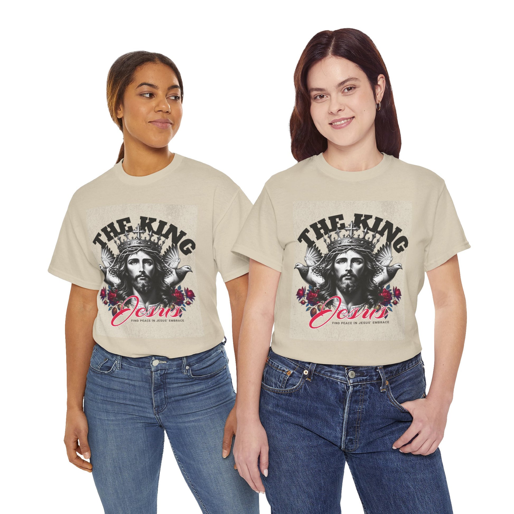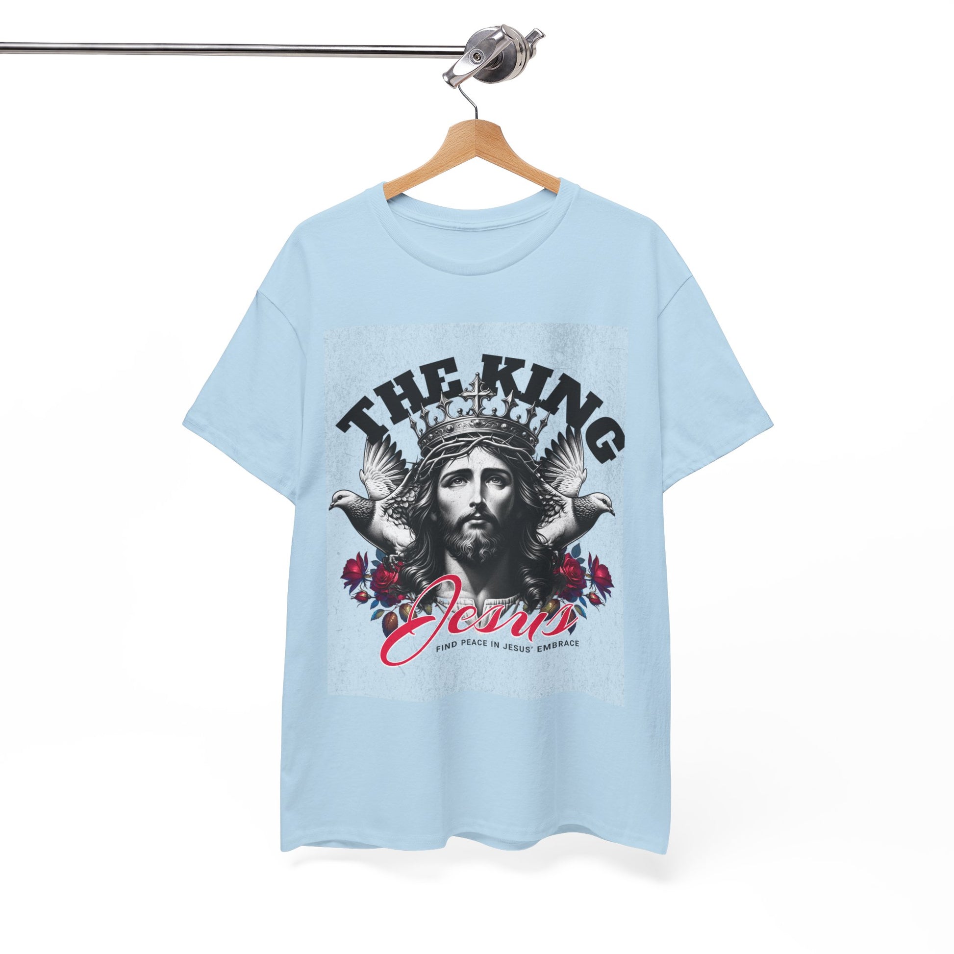 A religious-themed T-shirt featuring an image of our Lord Jesus Christ the King. This T-shirt is made from high-quality, smooth fabric that is perfect for printing, suitable for adults. It offers a classic fit for comfortable wear, with a crew neckline for a versatile look.