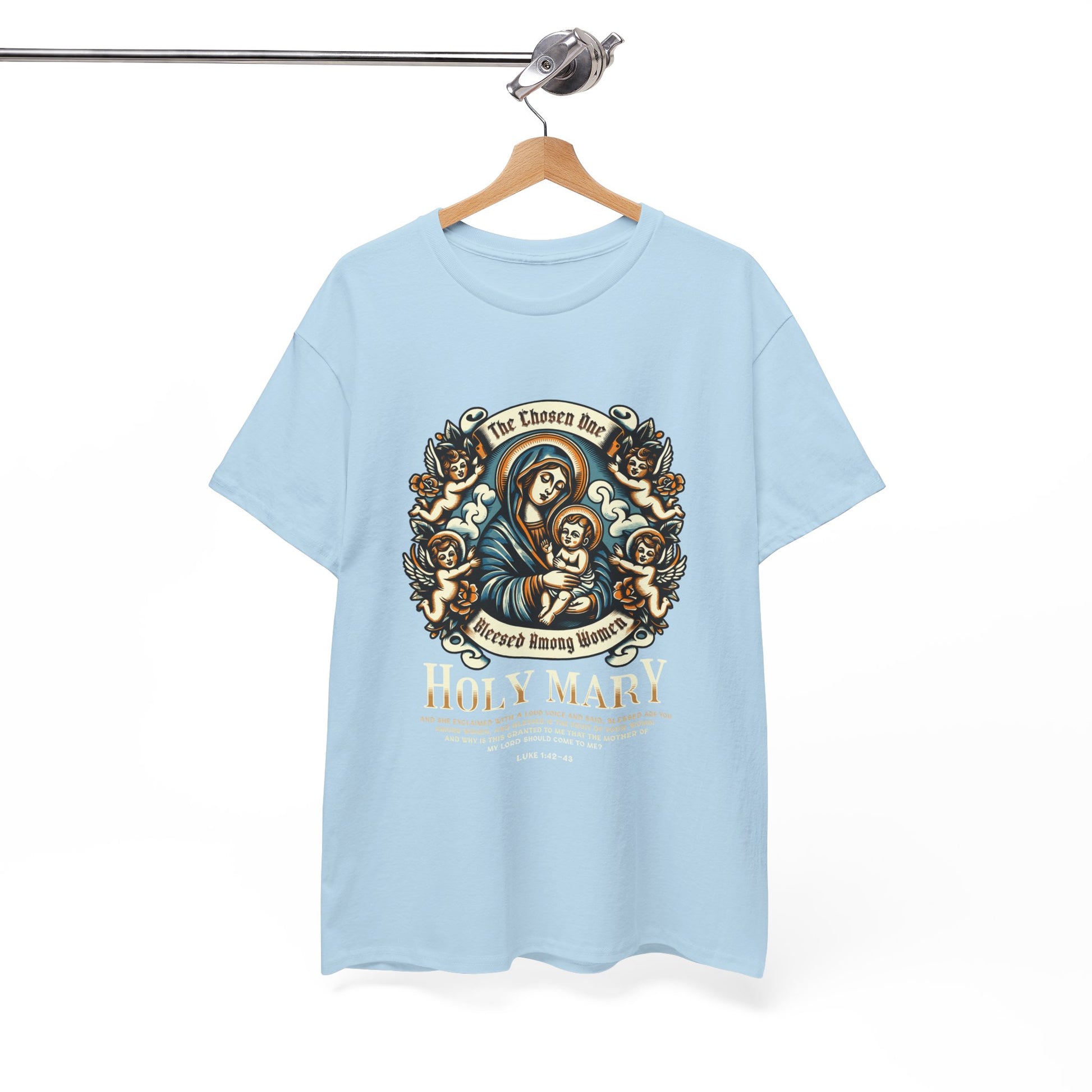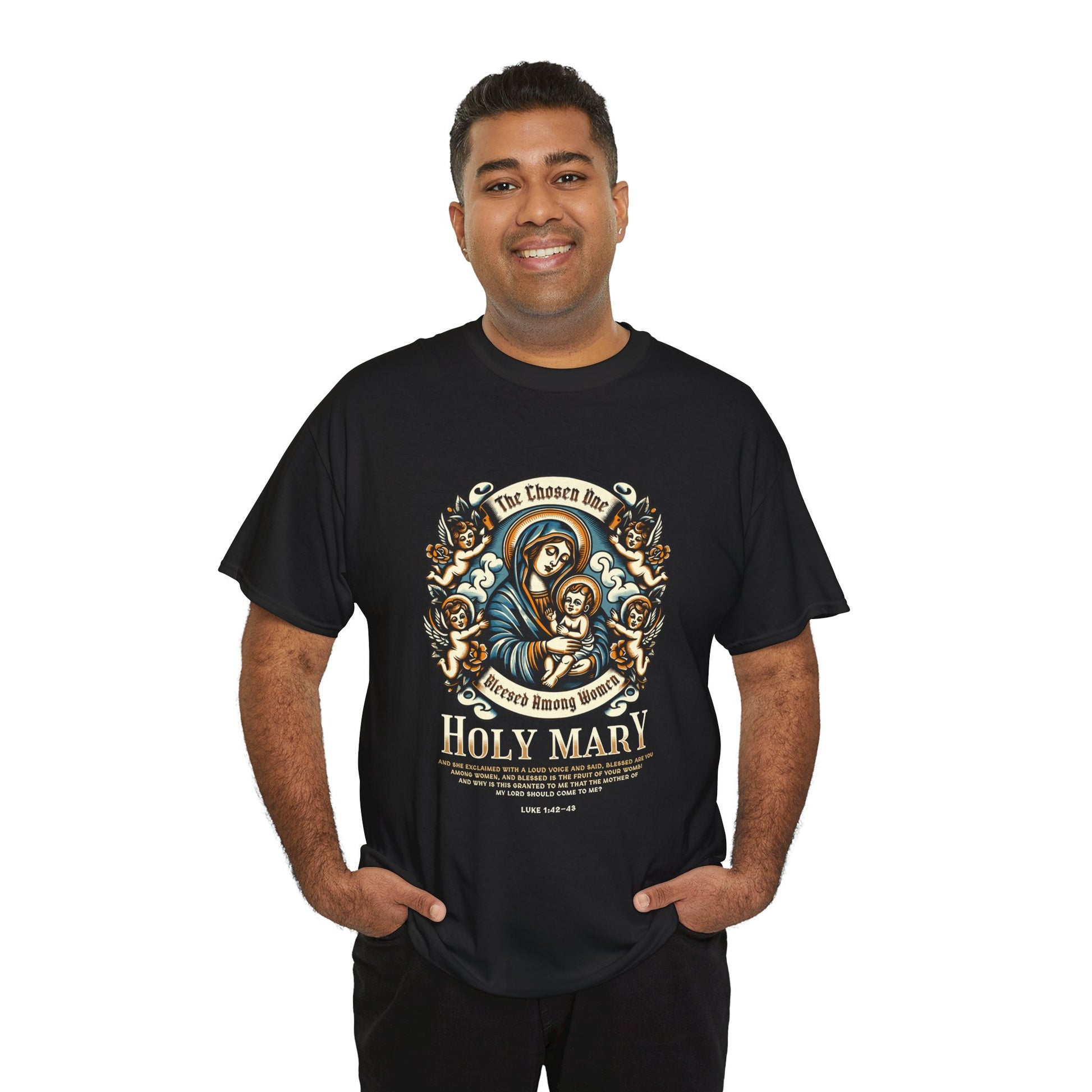 A classic Unisex Heavy Cotton T-Shirt featuring a design of Holy Mary Blessed Among Women. This tee offers year-round comfort with lasting durability, making it perfect for everyday wear or special religious occasions. Ideal for adults who appreciate high-quality, ethically made apparel.