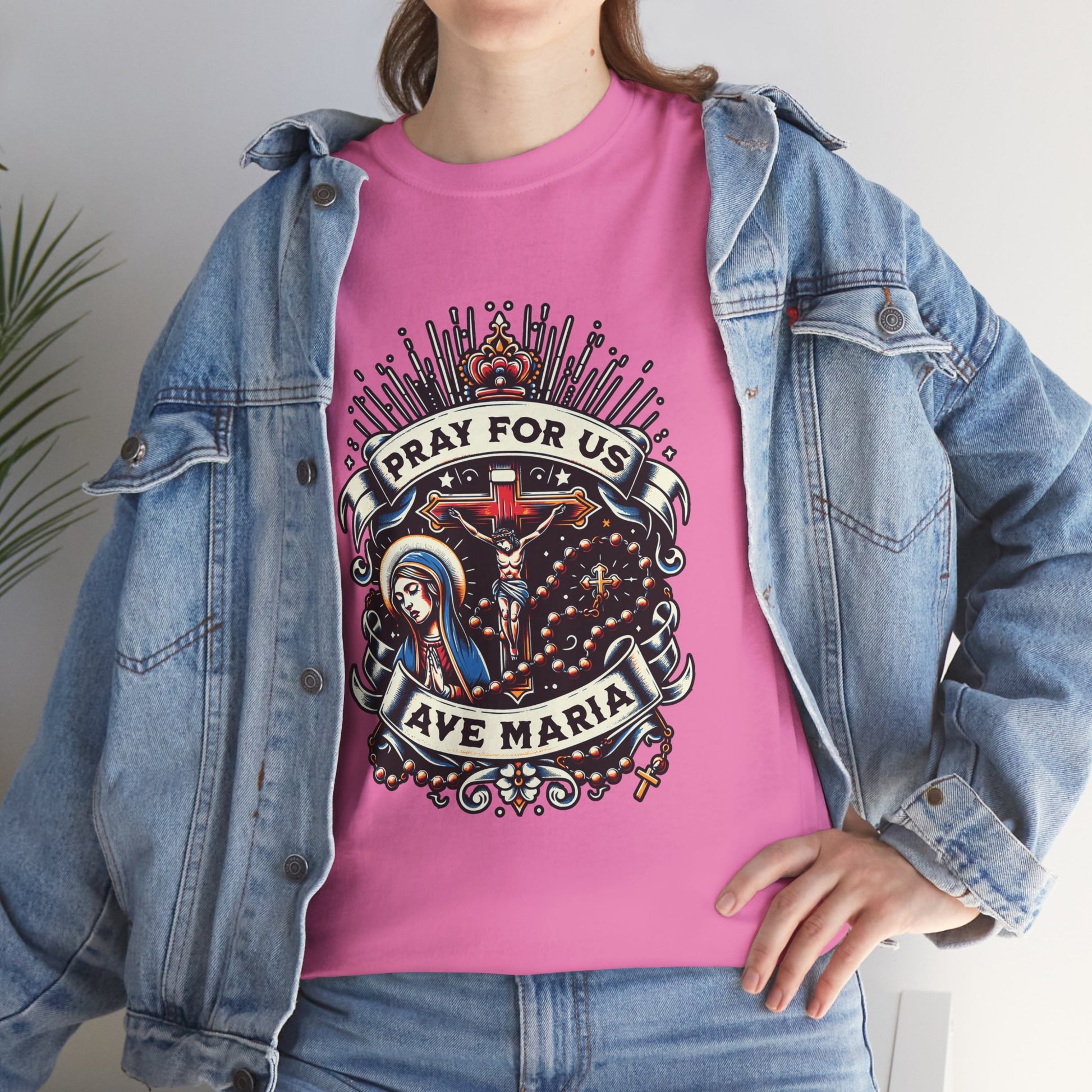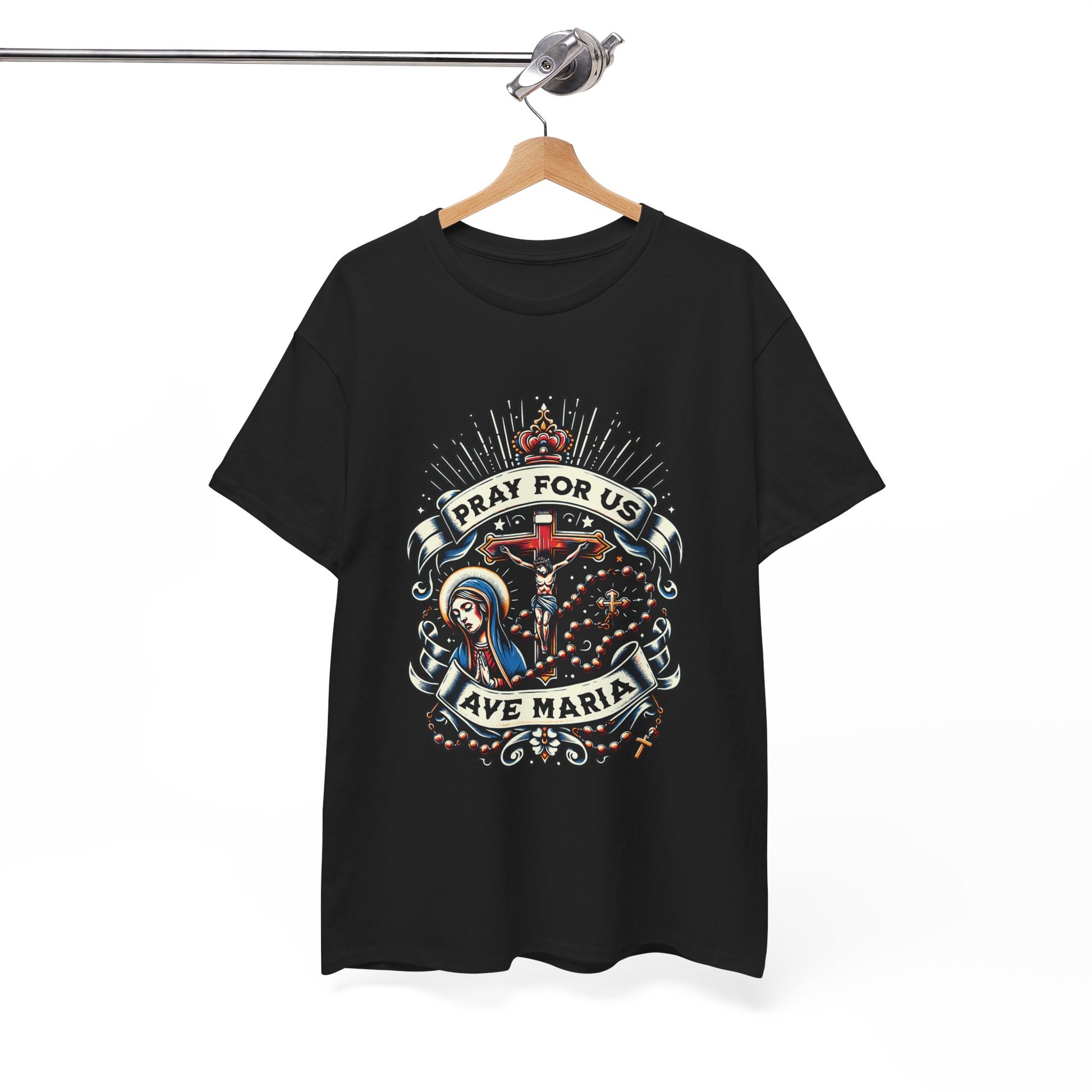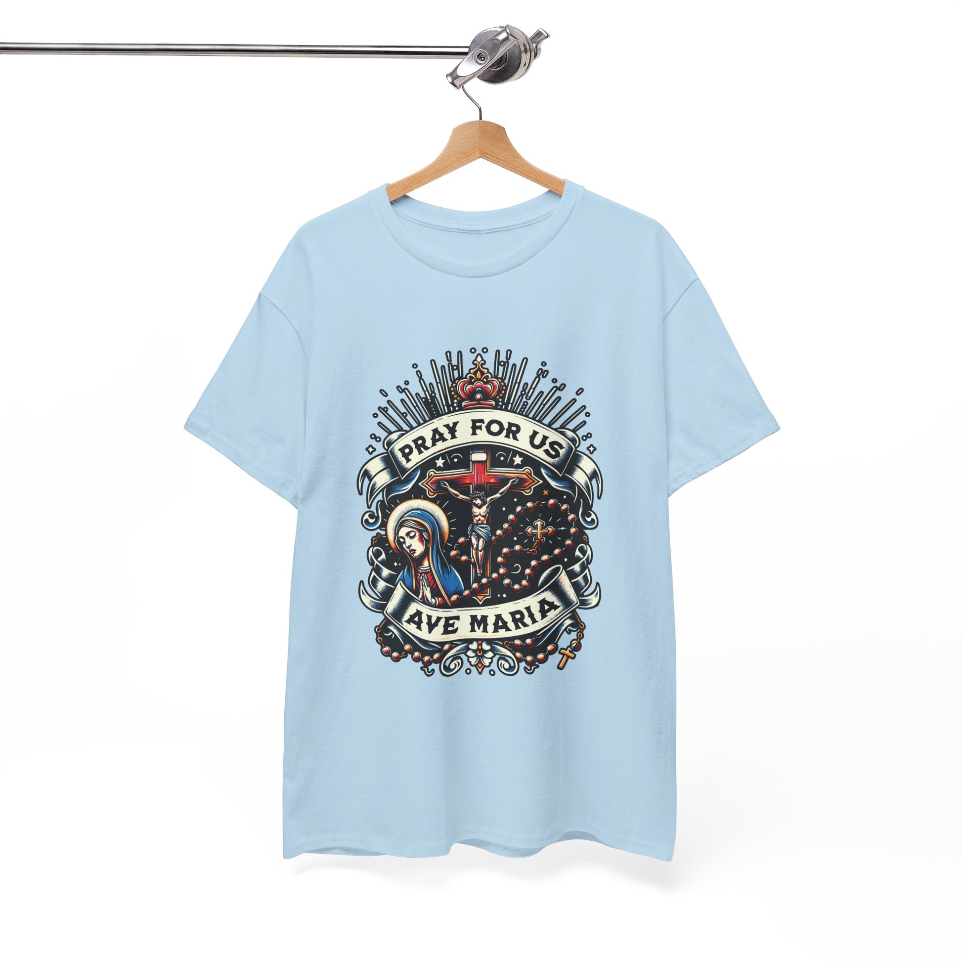This Ave Maria (Hail Mary) Full of Grace T-Shirt exudes a peaceful and spiritual vibe, making it a perfect addition to any religious person's wardrobe. Ideal for those who celebrate Catholic holidays and observances.